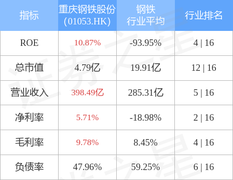 重庆钢铁股份市值4.79亿元,在钢铁行业中排名第12。主要指标见下表:
