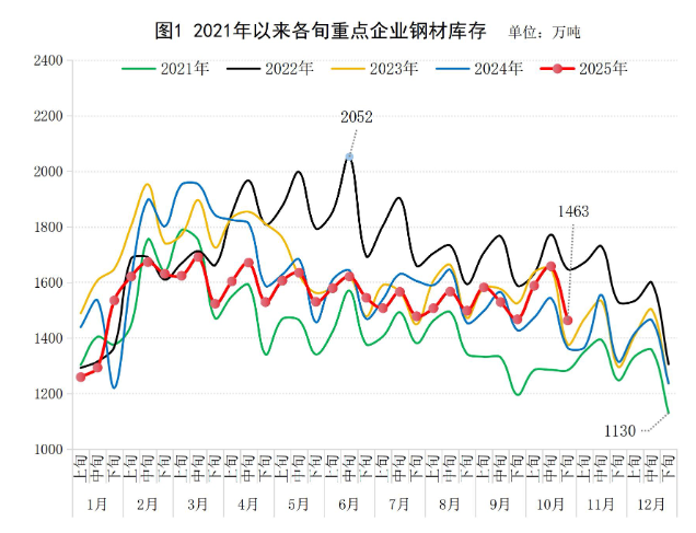 新华财经北京11月5日电 中钢协发布2025年10月下旬重点企业钢材库存旬报。2025年10月下旬,重点统计钢铁企业钢材库存量1463万吨,环比上一旬减少195万吨,下降11.8%;比年初增加226万吨,增长18.3%;比上月同旬减少4万吨,下降0.3%;比去年同旬增加99万吨,增长7.3%,比前年同旬增加86万吨,增长6.3%。