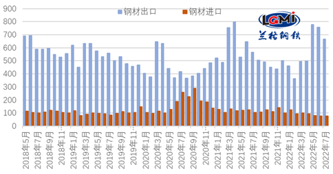 我国钢材出口量在5月份达到今年高点后,环比已经连续两个月回落,随着海外钢材需求走弱,价格持续下跌,国内钢材价格优势已显不足,7月份钢铁业新出口订单指数在收缩区间明显回落,受海外逐渐进入经济衰退期影响,钢材出口放缓的压力正在显现,预计后期出口量继续收缩。
