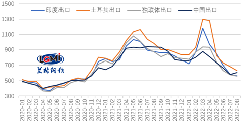 7月份,出口市场竞争激烈,主要出口国继续下调钢材出口报价。进入8月份,海外需求持续疲弱,各国钢材出口报价仍有所下调,而国内市场出现反弹,出口报价有所上涨,兰格钢铁云商平台监测数据显示,2022年8月5日,印度、土耳其、独联体热轧卷板出口报价(FOB)分别为565美元/吨、630美元/吨和560美元/吨,均较7月底有所下跌,中国热轧卷板出口报价(FOB)为605美元/吨,较7月底有所上涨。