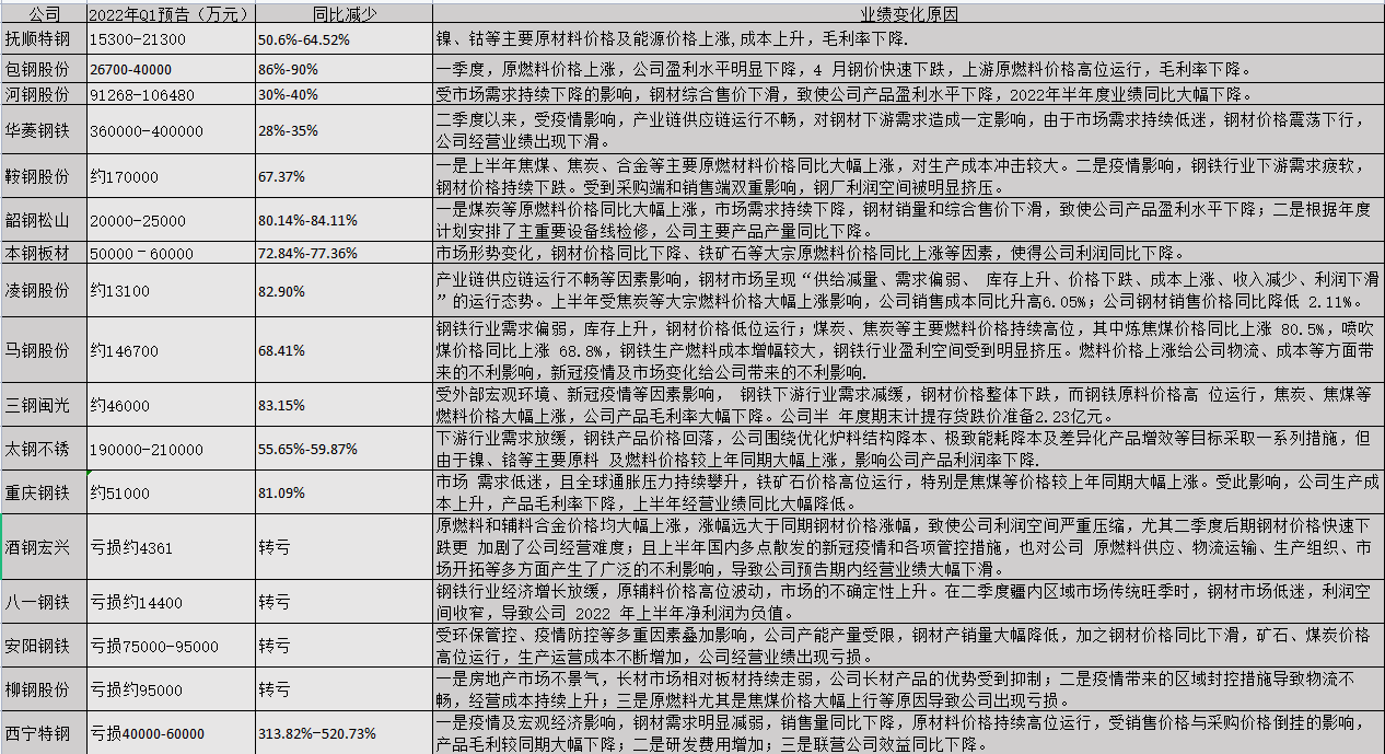 上市钢企2022年H1业绩预减预亏表(数据来源:上市公司公告、财联社记者整理)