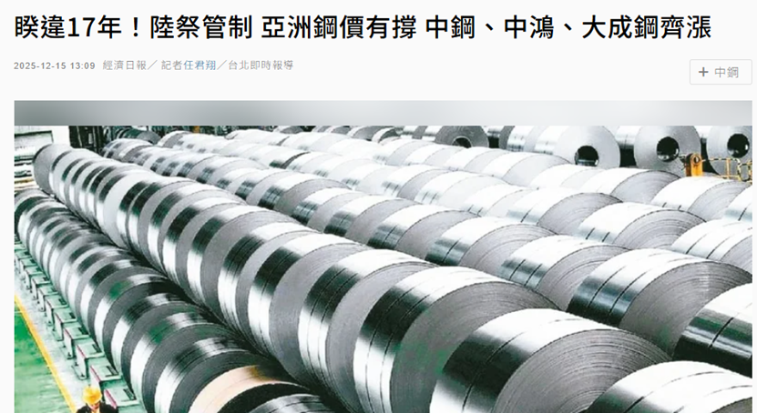 联合新闻网发文称,此举旨在管控出口过热、推动产业升级与绿色转型,将有望减缓低价钢材倾销,带动亚洲钢价预期止跌并可能反弹。