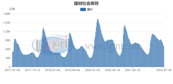 据兰格钢铁云商平台监测数据显示:7月29日,全国钢材社会库存指数为132.9点,比上月下降12.33%,比去年同期下降10.01%;其中建材社会库存指数为168.7点,比上月下降21.55%,比去年同期下降16.22%;螺纹钢社会库存量为553.13万吨,比上月下降21.89%,比去年同期下降19.36%;伴随着钢厂部分检修减产,及需求的阶段性释放,库存明显下降。
