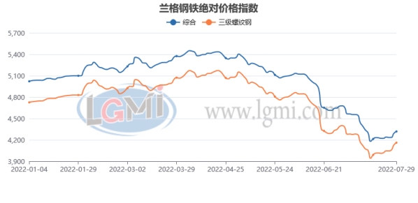 据兰格钢铁云商平台监测数据显示,截至7月29日,全国钢材价格综合指数为4324元(吨价,下同),月同比下降7.5%,比去年同期下降26.2%。高线指数为4414元,比上月跌216元;螺纹钢指数为4166元,比上月跌224元(详见图1)。
