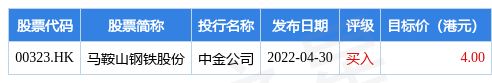 截至2022年7月21日收盘,马鞍山钢铁股份(00323.HK)报收于2.13元,下跌2.29%,换手率0.28%,成交量491.03万股,成交额1051.1万元。投行对该股的评级以买入为主,近90天内共有1家投行给出买入评级,近90天的目标均价为4。中金公司最新一份研报给予马鞍山钢铁股份买入评级,目标价4。