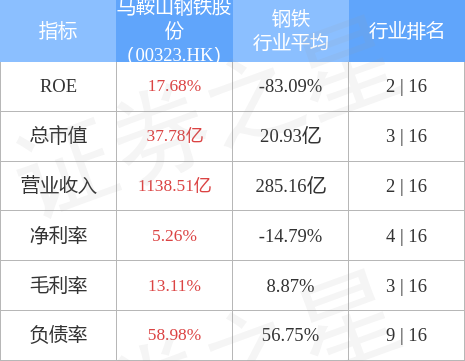 马鞍山钢铁股份市值37.78亿元,在钢铁行业中排名第3。主要指标见下表: